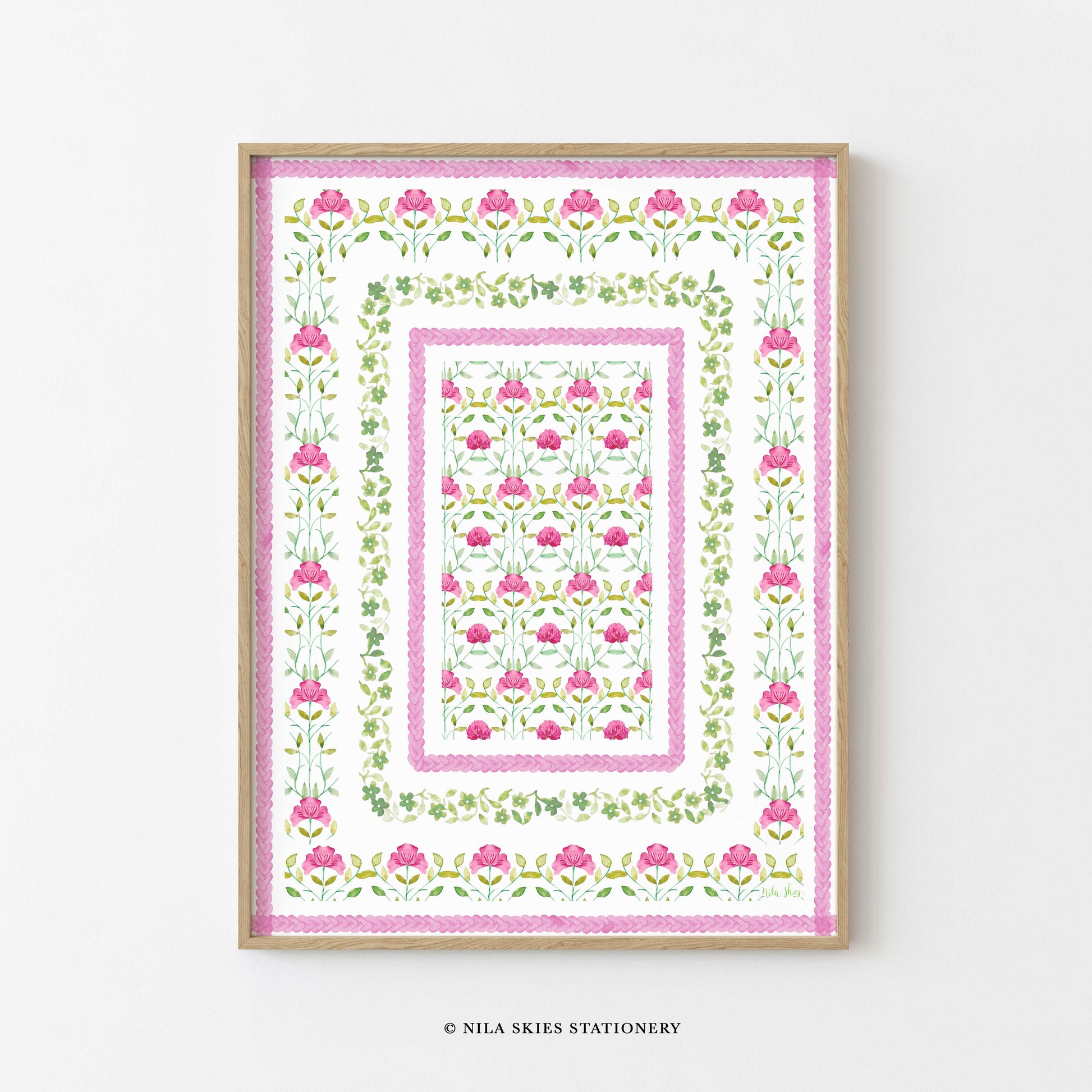 A print filled with the sweetest pink and green floral patterns and borders! How lovely would this look in a girls room, a sunroom or anywhere in need of a pop of pink florals!