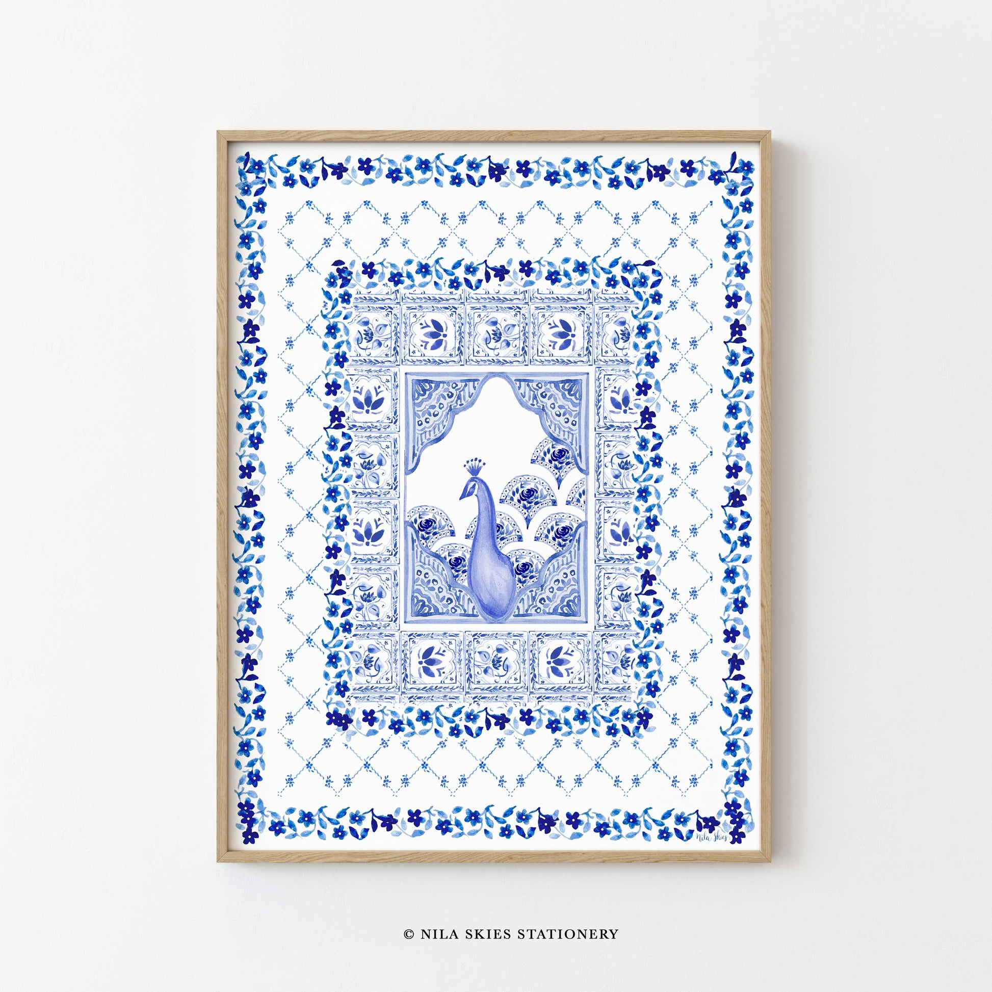 For all of my blue and white, peacock and maximalist fans: This beautiful peacock art print in royal blue will liven up any wall that's in need of some intricate details and hand painted love. This would look so nice in a guest room or an open hallway that's calling for some patterns!