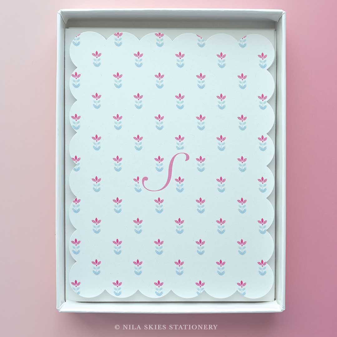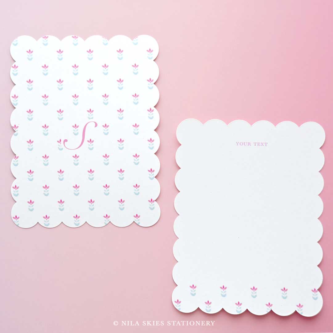 Add a touch of elegance to your correspondence with these beautifully crafted scalloped-edge notecards. Designed with delicate floral details and soft pastel hues, each card is customizable with your chosen initial on the front and personalized text on the back—making every note uniquely yours.